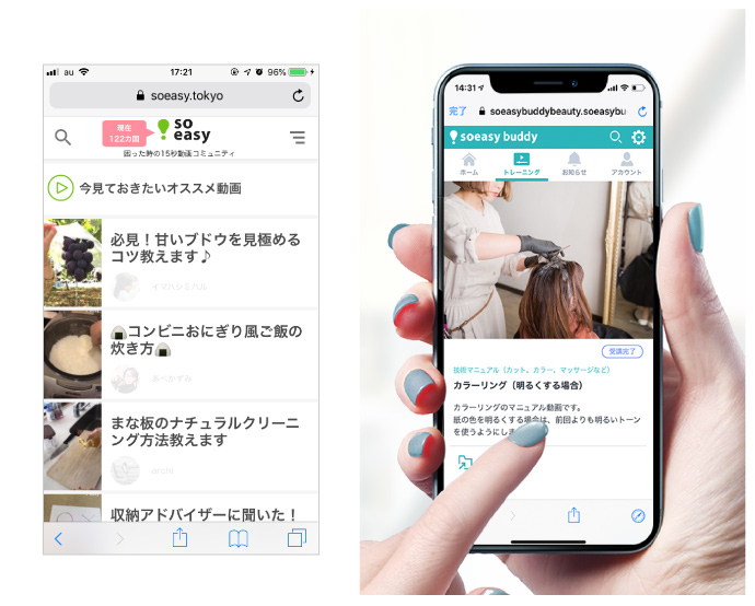 ‟生活の裏技”が集まる15秒動画コミュニティ「soeasy」㊧と、soeasyの知識共有ノウハウを活用して美容サロン向け動画トレーニングに特化した「soeasy buddy for beauty」