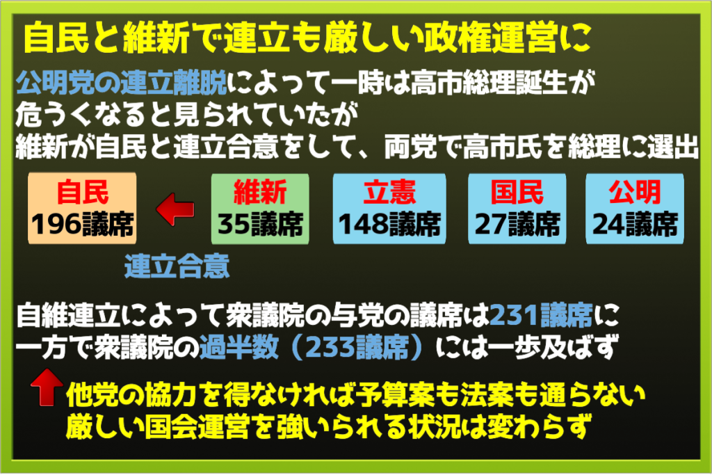 こうして、自民と維新の連立が成立し、公明が抜けて危ういと思われていた高市総理誕生を、何とか実現することができたのです。