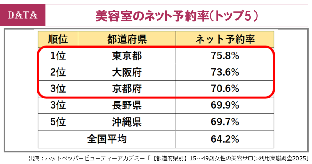 これらのエリアでは、スムーズで使いやすいネット予約システムを導入・アピールすること自体が、競合サロンに対する大きな優位性となる可能性も秘めています。