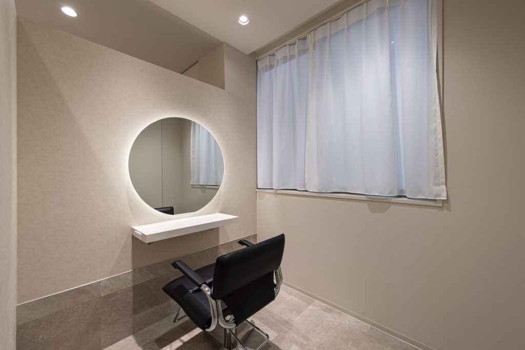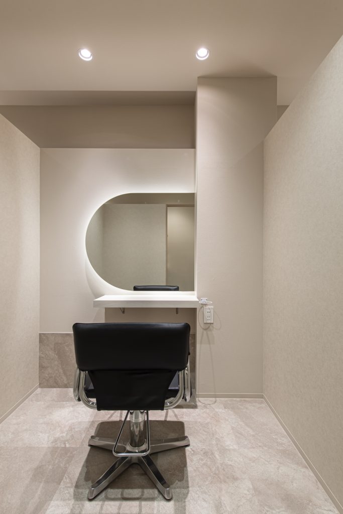 セット面は10面、すべて半個室。円形ミラーと背面の間接照明で明るさを確保し、床材を壁に少し延ばして広がりを演出している。限られた空間をゆったりとメリハリのある印象に仕上げる工夫が凝らされている。