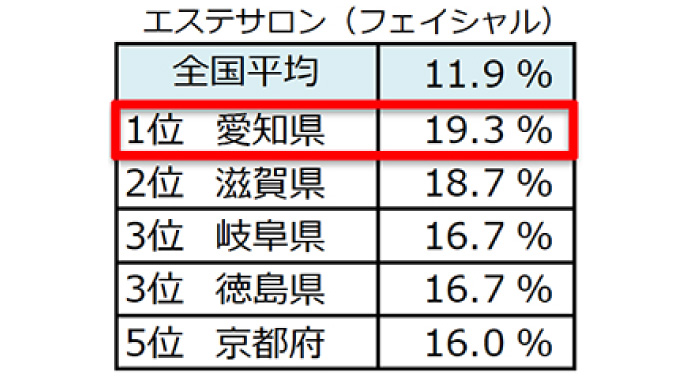 愛知県の利用率は「美容室」92.7%、「エステサロン(フェイシャル)」19.3%。いずれも全国平均に大きく差をつけて1位となっている。