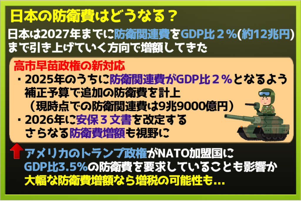 トランプ大統領は北米欧州の軍事同盟であるNATO加盟国に、GDP比3.5%まで防衛費を増やすように求めており、日本もそれに倣うのではないかと見られています。