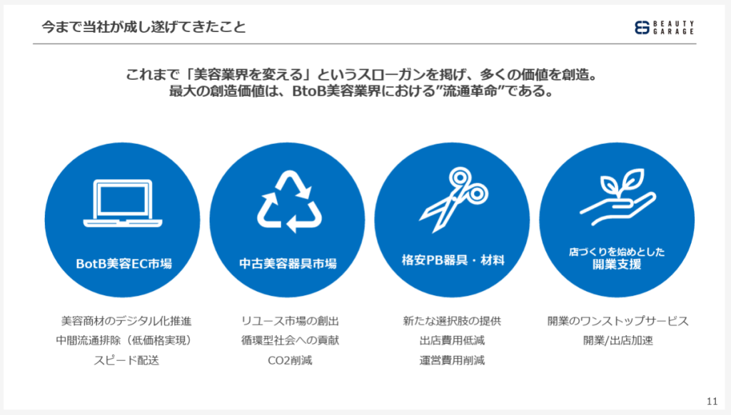 私たちが創造してきた価値の一つは中古美容器具という市場を創出したことです。そして、業界に先駆けてECサイトを立ち上げ、プロ向け美容商材の流通に革命を起こしたこと。さらに格安なプライベートブランドの器具や材料を開発してサロン様のコスト削減に貢献したこと。そして開業支援です。