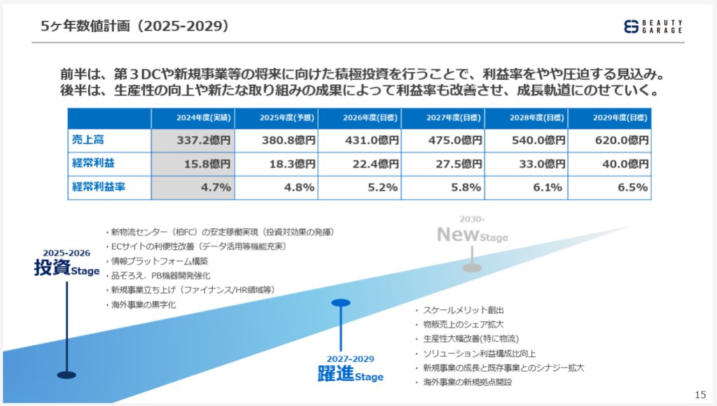 当社の中核であるECサイトは月商20数億円ですが、品ぞろえを強化して、買いやすさ・選びやすさを引き上げます。昔から当社をご存知の方は機器のイメージが強いかもしれませんが、いまは物販事業の6割以上が化粧品・材料で、NBメーカーとの取り引きが年々増えています。生成AIなどの新技術も取り入れて利便性を一層高め、持続的な成長のループを実現します。