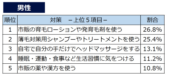 薄毛対策として「市販の育毛ローションや発育毛剤を使う」割合は男女ともに最も高く、男性が26.8%、女性は28.2%だった。他の対策としては、「薄毛対策用シャンプーやトリートメントを使う」「自宅で自分の手だけでヘッドマッサージをする」「睡眠・運動・食事など生活習慣に気をつける」などが挙がった。