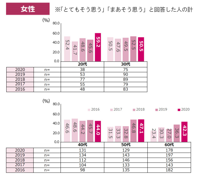 反対に、女性は「同性の友人(30.8%)」、「職場の同性(18.3%)」と同性の目を気にしている人が多い。また、女性も2016年と比較して、全体的に他人の目を気にする人の割合が増えている。それ以外の傾向としては、「配偶者」の目を気にする割合が年々減り、反対に「職場の異性」の目を気にする割合が増加したことで、2020年は「配偶者」と「職場の異性」の順位が入れ替わっている。