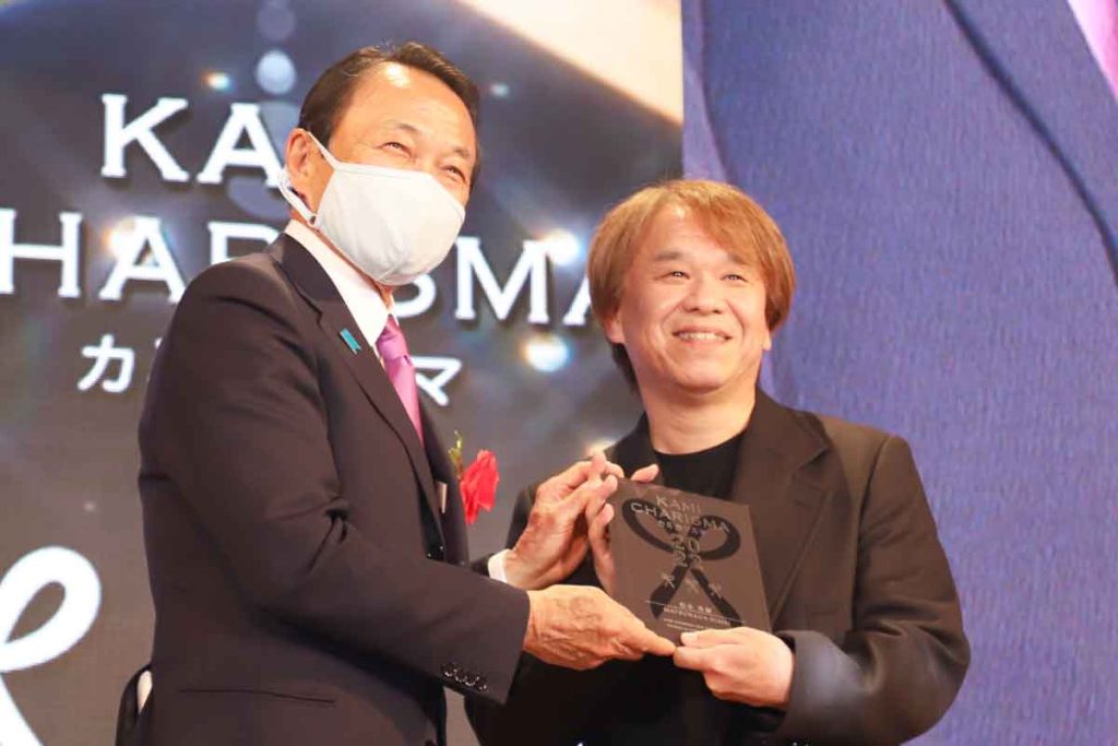 堂々3連続受賞の宮村浩気氏(AFLOAT)㊨と麻生太郎会長